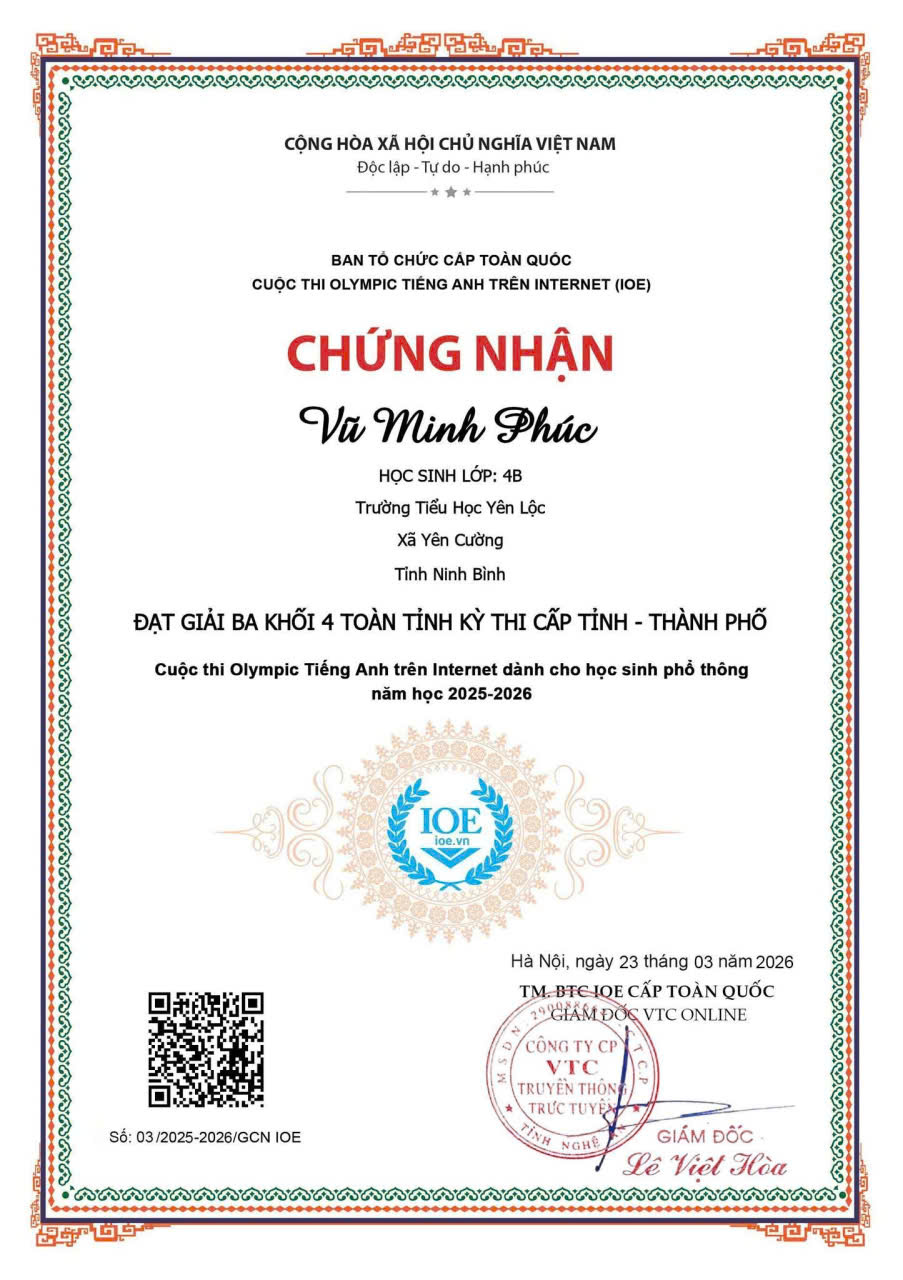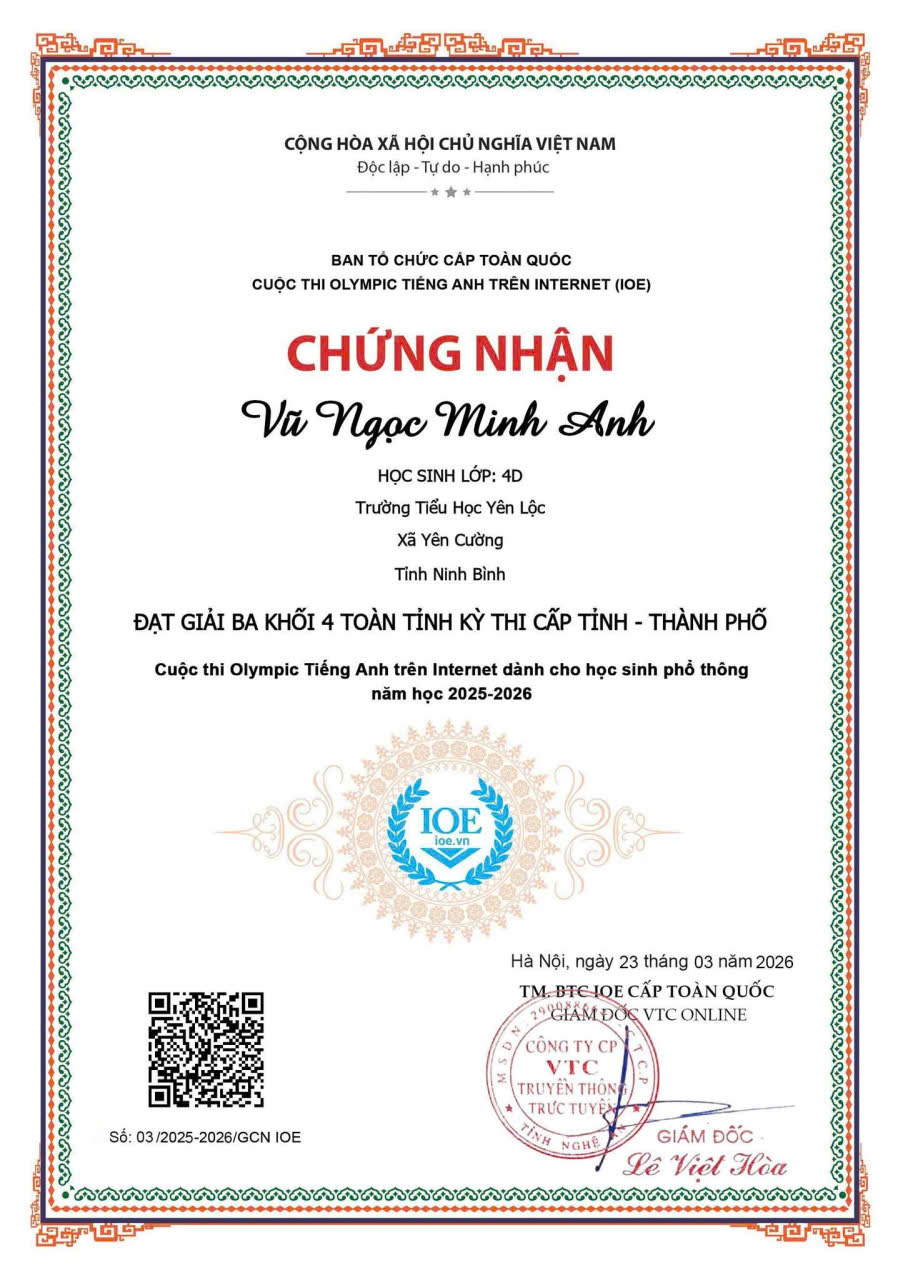 Trường Tiểu học Yên Lộc vinh danh các em học sinh đạt kết quả cao trong kỳ thi IOE CẤP QUỐC GIA và CẤP TỈNH